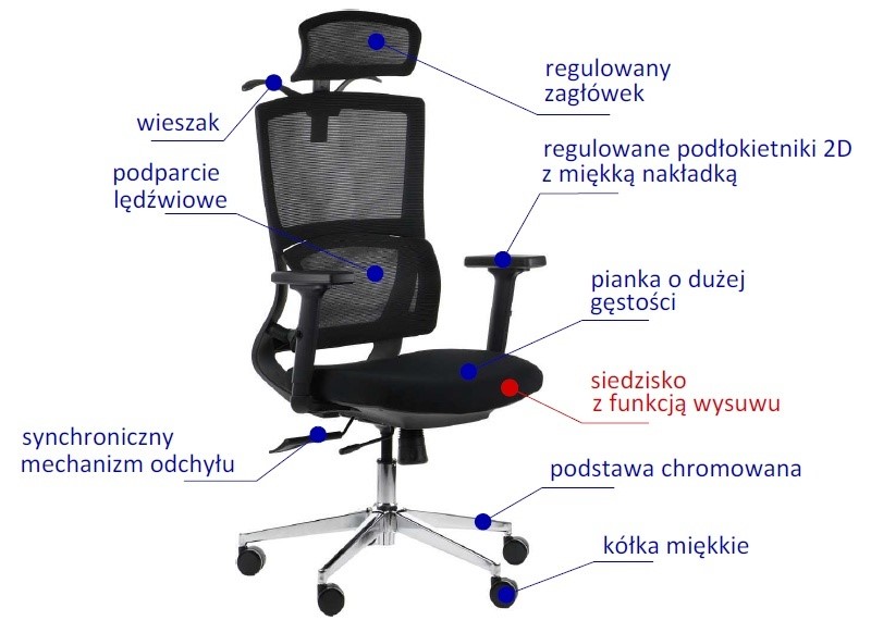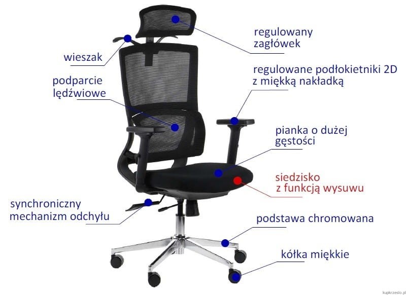 Oparcie z siatki – Wykonane z przewiewnej siatki, oparcie pozwala na odpowiednią cyrkulację powietrza, co zapobiega poceniu się i zapewnia komfort nawet w cieplejsze dni.
