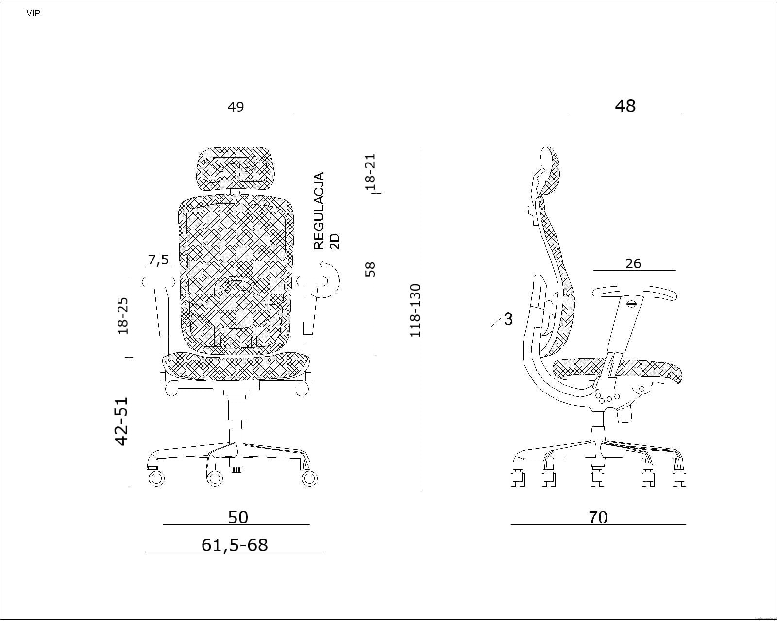 - Regulacja podłokietników 2D – podłokietniki regulowane w dwóch kierunkach (wysokość i szerokość) pozwalają na pełne dopasowanie do ciała użytkownika, zwiększając komfort pracy.